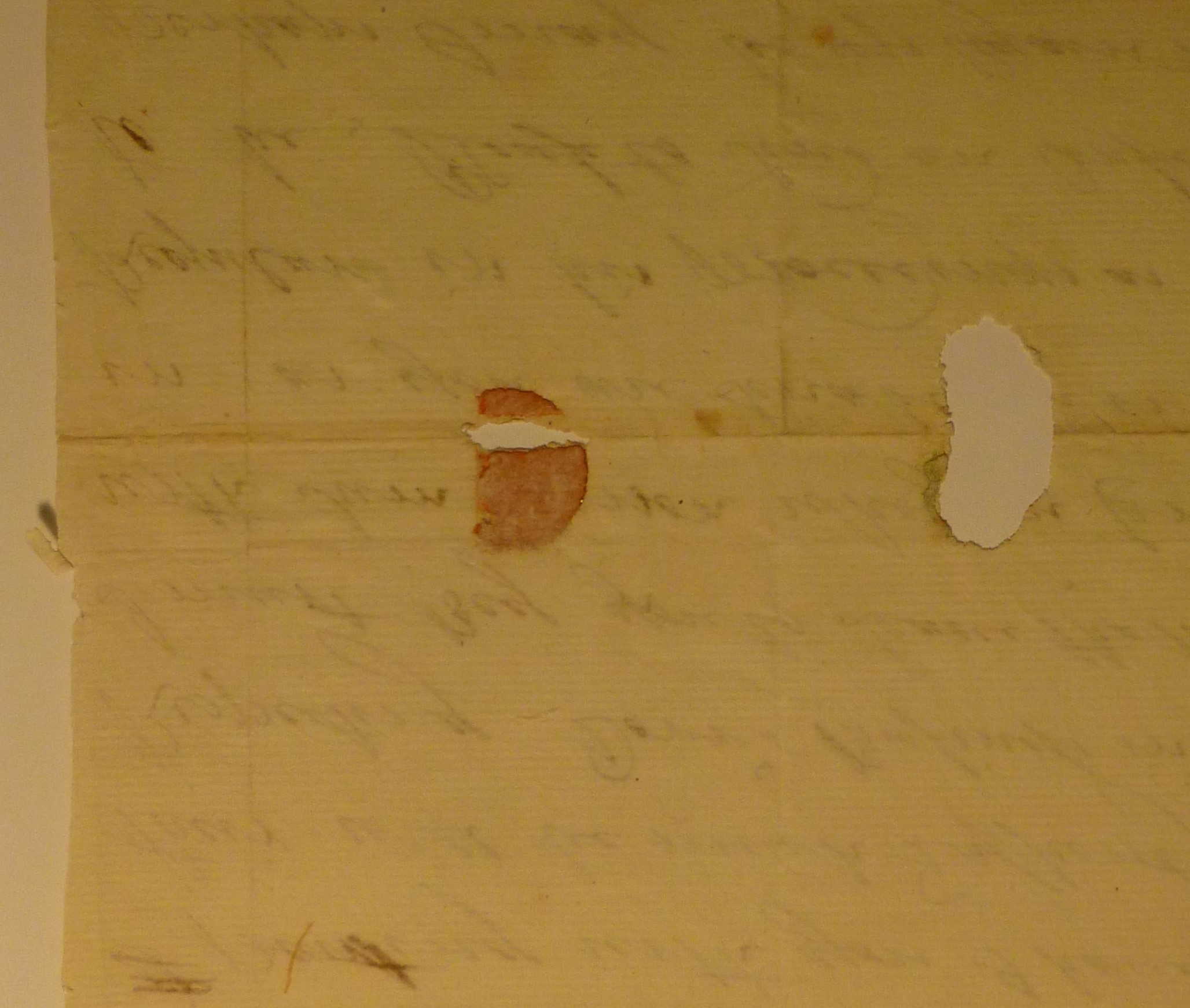 From consulting letters in the NY Public Library to the Connecticut Historical Society (now the Connecticut Museum of Culture and History), and within private collections, local historical societies, and in the dusty basements of older town hall buildings, I began to see a development in letters and how they were sent.  For the Revolutionary War period, those that still had pieces of sealing wax were in keeping with our common perception of how letters were sealed before sending.  Unless a scrap of paper, it was almost always a case of a large sheet folded in half, and once written upon, folded again into a rectangle roughly 3″x5″, and the outermost fold would be folded again so that the outer side and away from any writing would be sealed against the opposing side with a dollop of wax.  Sometimes a seal would be pressed into the wax, showing an image or initials… More often than not, the wax would be completely between the paper and presumably pressed until it cooled and so sealed, using a thumb, perhaps, or the flat edge of something hard.  When the letter was opened by the receiving party, it would typically tear a bit of the paper, leaving a small hole that could sometimes take a piece that had some of the writing upon it…