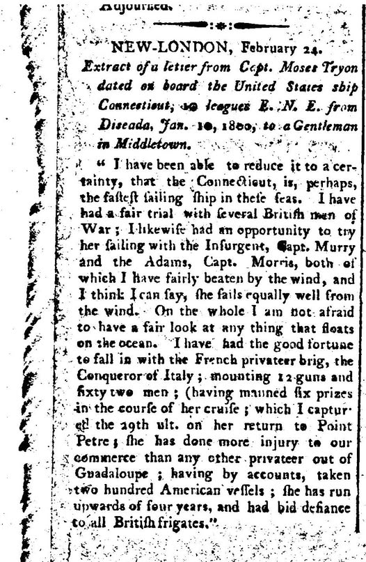The USS Connecticut was attached to the convoy headed by Thomas Truxtun in the USS Constellation, but by the time Connecticut had arrived, Truxtun had sailed his ship back home for repairs, leaving Capt. Richard V. Morris in the USS Adams, 22 guns, in charge. The Connecticut was to cruise largely between Puerto Rico and Guadaloupe, with usual naval charge to “sink, take, or destroy” the enemy. During her one year tour (enlistments for the Navy were for one year at first), she captured four enemy vessels (the most famous being the privateer brig L’Italie Conquise), recaptured six American vessels in the hands of the enemy, and caused the destruction of two more enemy vessels by running them aground in chase, setting fire to one to prevent her from being used again while the other was so badly damaged that it would never sail again.