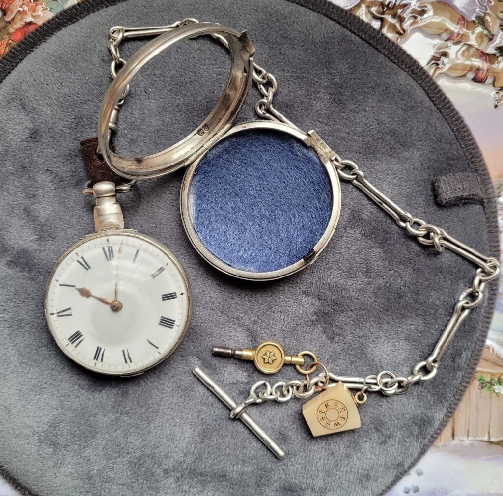 In February 2025, I made the purchase of an antique verge fuzee watch, a “paired” one, from a seller in the UK. To have a working pocket watch from “my” era (1790 – 1810) has been on the top of my “bucket list” since about 1990, and this was most exciting for me! I tried for one dated ostensibly to 1805, but while I “won” that auction, it didn’t meet the seller’s reserve price, whatever that was supposed to be. I played the game a second time, won again, and still didn’t meet the hidden reserve price. I made a direct offer which was turned down, and so I moved on to another lovely, silver pocket watch that was dated to 1816. Of course, this is much later than “my era” of the 1790s-18-aughts range, but this seller stated that it was working although in need of some TLC. I won this auction and the seller sent it along.