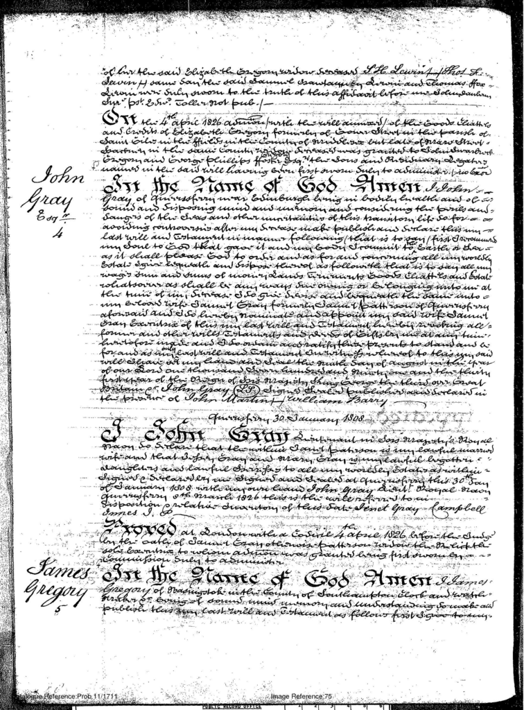 This will was “proved before the judge” by the oath of “William Gregory, the nephew and residuary legatee substituted in the said will to whom administration was granted...” in London on 5 April 1826.